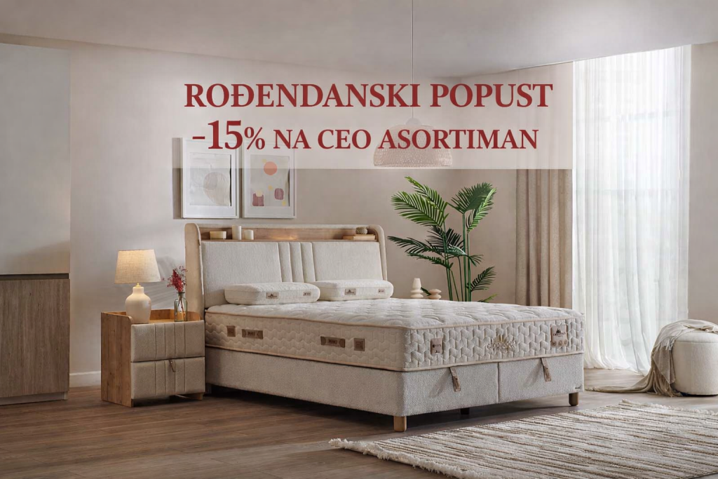 Uživajte u 15% popusta na kompletan asortiman i pronađite idealno rešenje za vaš dom. Bilo da opremate spavaću sobu, dnevni boravak ili tražite savršen dušek – sada je pravi trenutak za kupovinu.